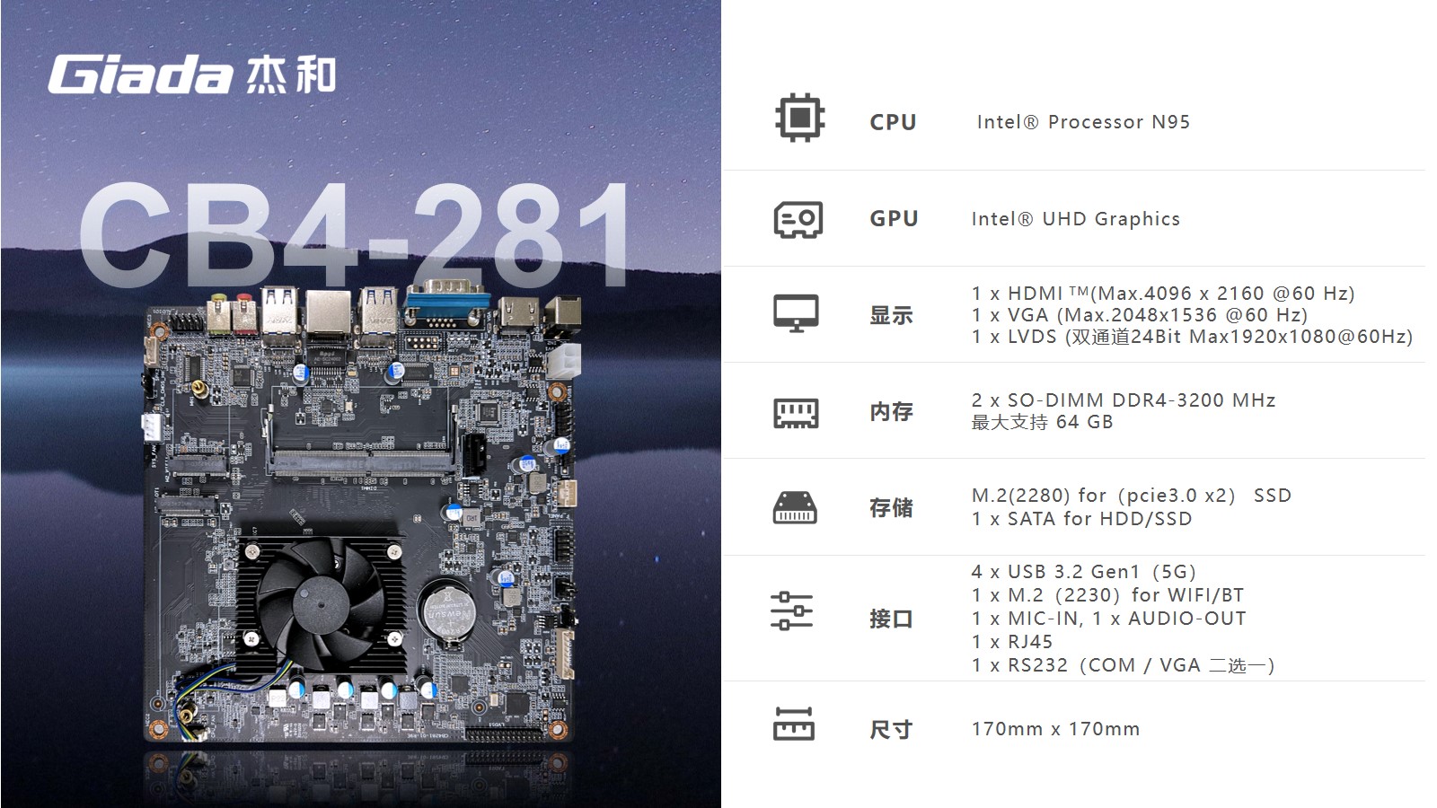 CB4-281的芯片为Intel Alder Lake N95 ,该芯片采用了混合架构设计,结合了性能核(P-cores)和能效核(E-cores),6M高速缓存,睿频至高可达3.40 GHz,适合长时间运行而不需要大量电力的场景。