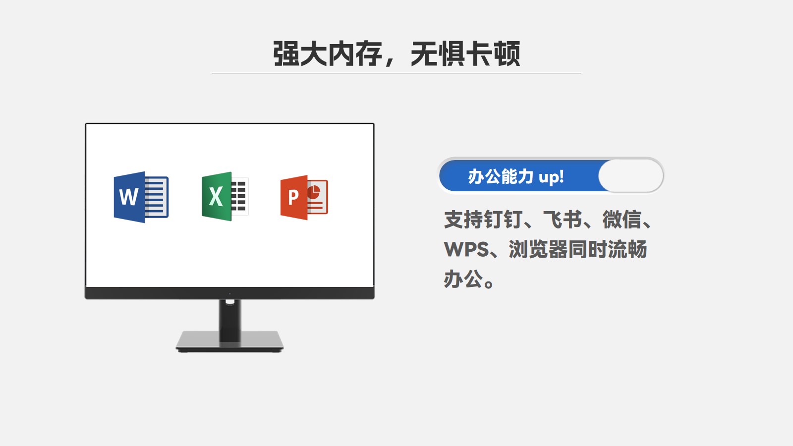 双通道SO-DIMM DDR4-3200MHz架构,最大支持64GB内存扩容,满足多任务处理需求,可流畅打开各网页、Excel表格、钉钉视频会议等应用,彻底打破了"多开必卡"的办公魔咒。