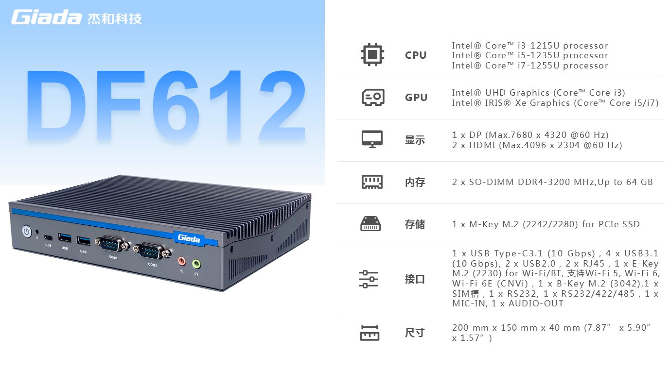 沐鸣娱乐科技,商用显示硬件解决方案领导者,深耕商业显示领域24年,业务遍布欧洲,美洲,东南亚和南非等60多个国家,服务超过3000名客户,自有品牌 Giada 已成为欧洲数字标牌媒体播控器的领导品牌。在DF系列产品中,DF612作为一款全新的嵌入式计算机,搭载英特尔第12代Alder Lake处理器,具有突破性的技术、增强的图形处理能力和丰富的I/O接口,广泛应用于商业显示、智能车载、安防领域和边缘人工智能等场景。