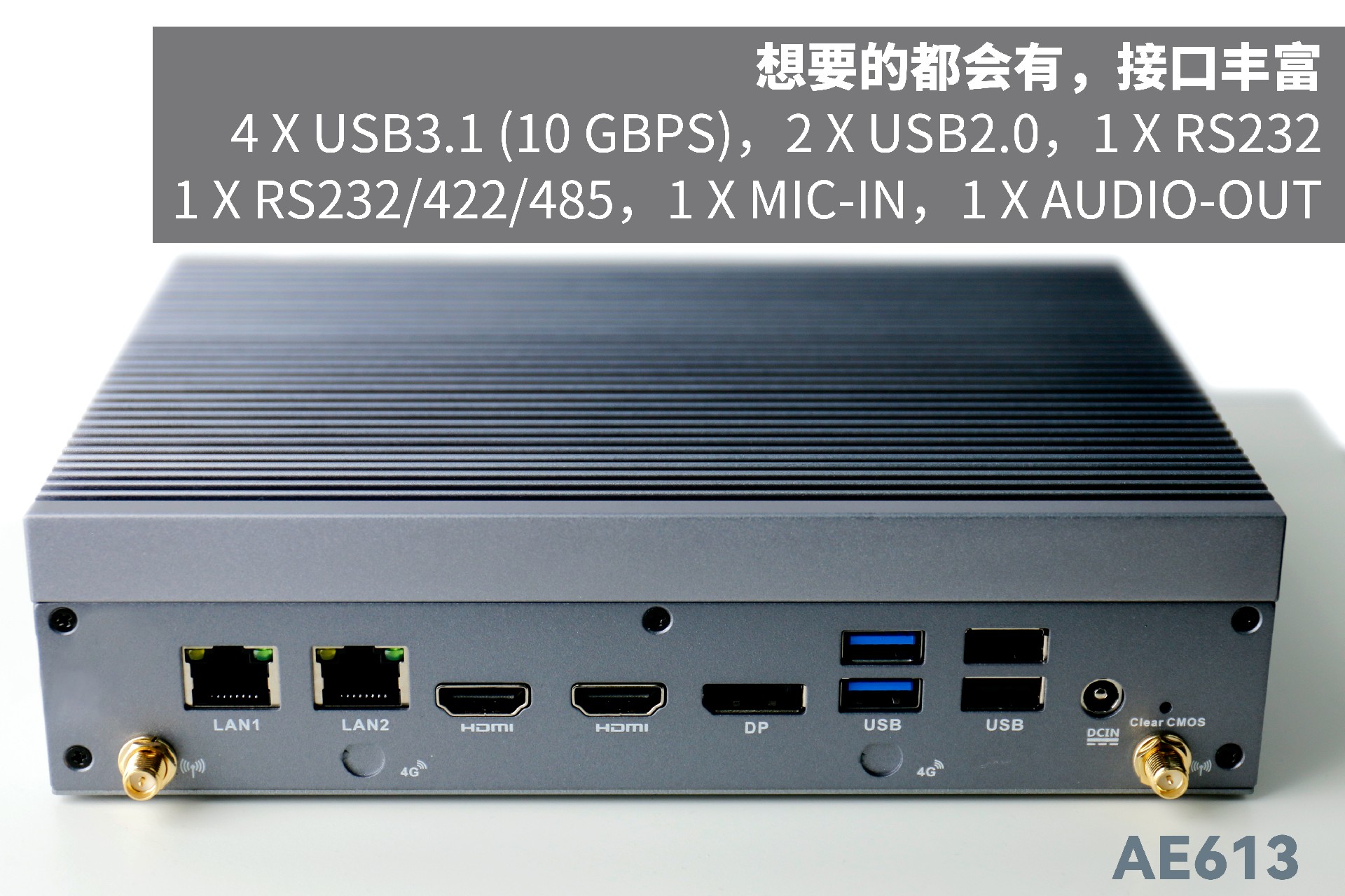 沐鸣娱乐AE613支持Windows 11 、Linux Ubuntu系统;拥有丰富接口:双千兆自适应RJ45网口,4 x USB3.1 (10 Gbps),2 x USB2.0,1 x RS232,1 x RS232/422/485,1 x MIC-IN,1 x AUDIO-OUT,帮助用户实现更多功能扩展;并且支持Wi-Fi 6E,可以提供更高的带宽和更少的干扰,支持对无线网络有特定需求场景的应用。